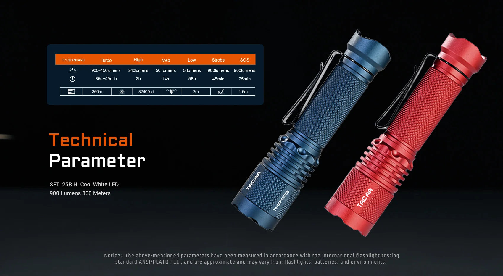 • LED version 1: Utilizes a SFT-25R HI 6500K LED with max output 900 lumens and max throw of 360 meters