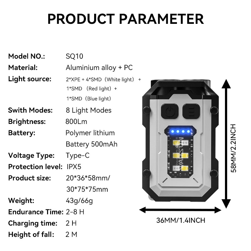 Light source: 2*XPE + 4*SMD(White light) + 1*SMD (Red light)+ 1*SMD(Blue light)
